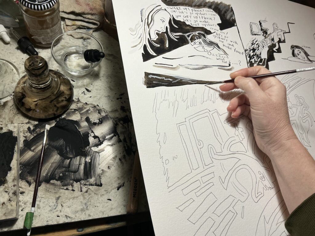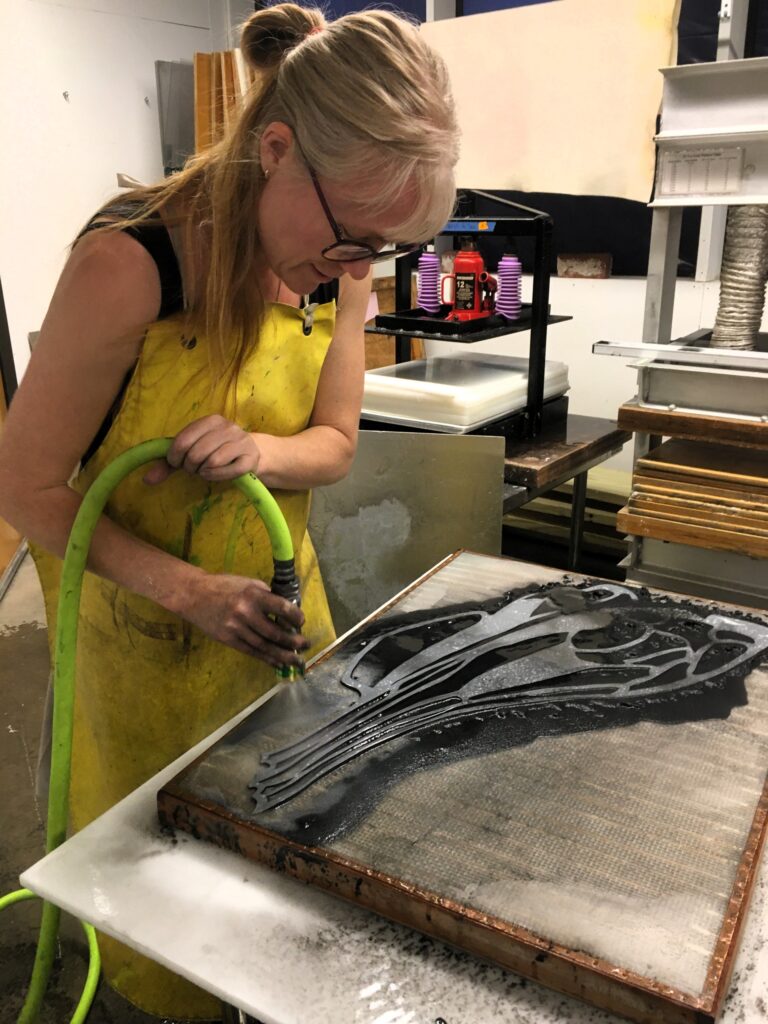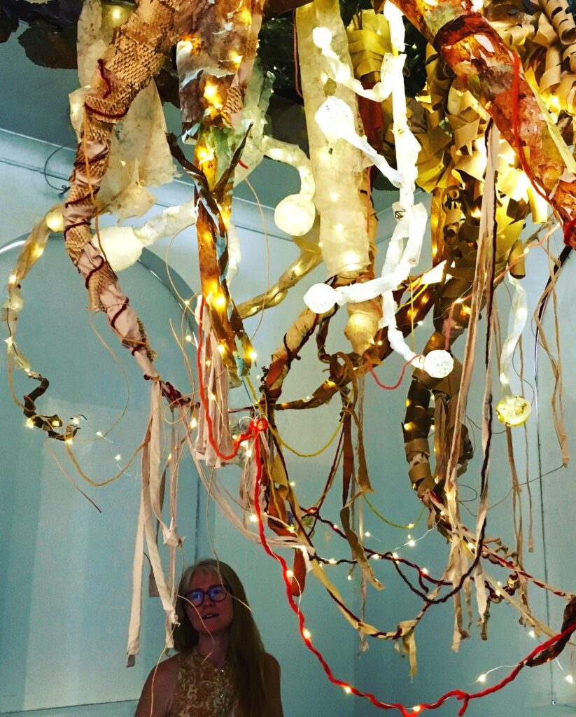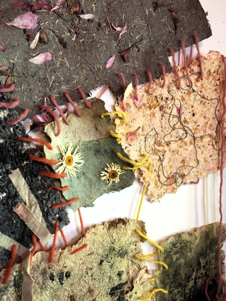 Sarah Hope is an autistic artist whose work is quite diverse, spanning from watercolour and oil paintings to hand dyed and handmade paper installations. Her themes have also traversed from the beauty of impermanence, grief and death, to women and neurodivergent researchers, to biodiversity and pollinators. Much of her artwork combines foraged and handmade materials with video, sound and lights to create immersive experiences. She also combines pigments made from rock and bone with traditional watercolour paint, creating paintings of local hummingbirds and owls that she photographs near her home. She has been extensively researching and creating with the under-represented mediums of handmade paper, natural dyes, and artist-made colour for many years. These multi-step processes are old crafts that align with her natural deep focus. Grinding rocks for colour or shredding plant fibres for paper both appeal to her needs to move the body and align with striving towards a sustainable art practice. By making slow art, she finds there is space created to process emotionally, which then transfers to the final work. Being recently diagnosed, she is still processing how her autistic traits such as sensory sensitivity and attention to detail have been instrumental in her art. Sarah has a diploma of Fine Arts and in 2023, she spent 6 weeks learning about the craft of fine paper at Penland School of Craft, North Carolina. With support from Canada Council for the Arts and BC Arts Council, she has presented her work in various galleries as solo and group exhibitions. In 2019 Sarah won the Marie Manson Art award which launched her interest in artist-made palettes. Sarah is a settler born and raised in Tkemlúps, (Kamloops), and works on the traditional lands Switzmalph te Secwepémc, (Salmon Arm). Her art can be viewed on IG at @sarahhope_art and www.sarahhope.ca